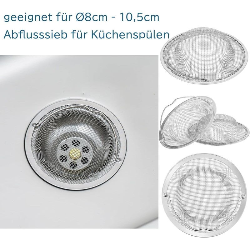 Set of 3 stainless steel strainers for kitchen and bathroom. One for the bathroom, one for the kitchen and one for replacement. They catch everything and the drain remains protected. They are also very easy to clean.