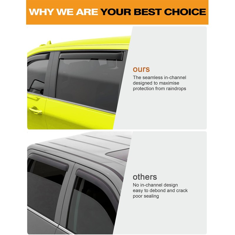 • Perfect Fit IN-CHANNEL INSTALLATION provides perfect fit for your car. Just slip it onto your car's window and your job is done within minutes. No drilling or special hardwares required. [NOTE: Don't wash your car 24 hours after installation.]