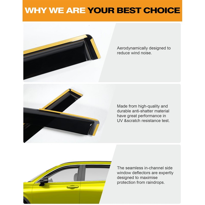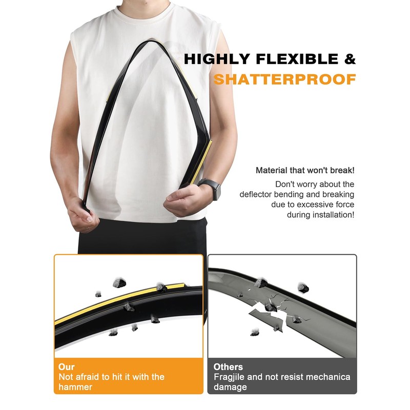 • Extra-Durable PolycarbonateDeejecsun Window Deflectors made of long-lasting shatterproof material, offer ultimate protection against heat, wind, rain, and environmental damage, ensuring a safe and comfortable journey .