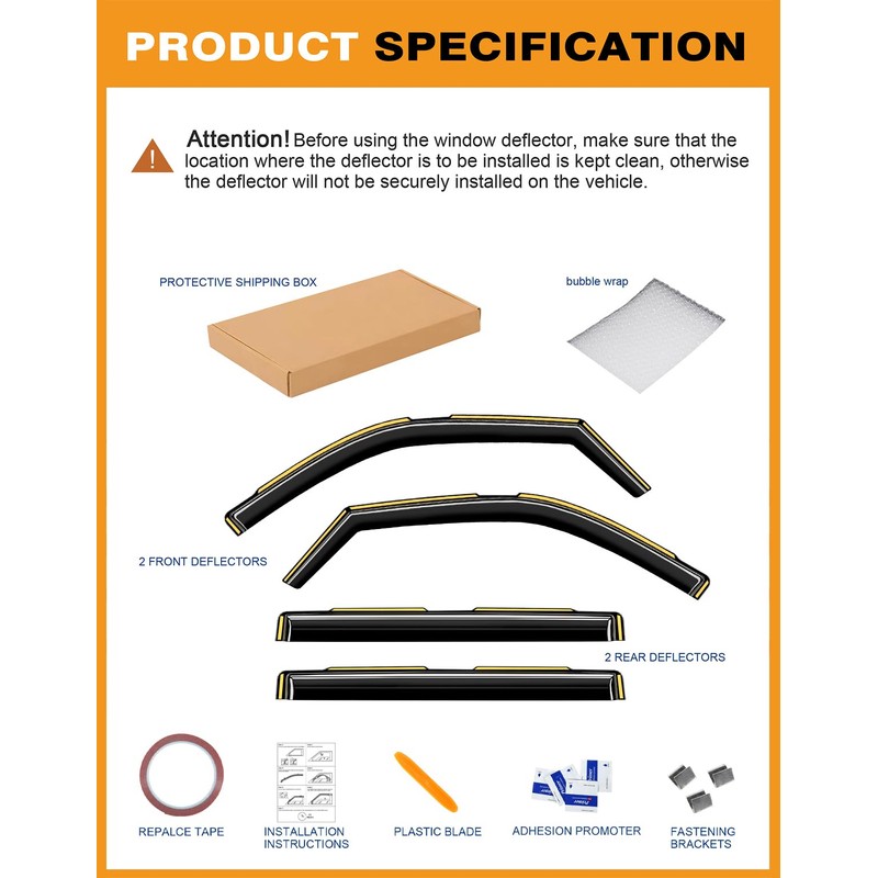 • Full-size Side Window DeflectorsThis 4-piece set includes passenger, driver side rain guards that create a seamless look that protects you from sun rays, rain drops, and wind while you're driving with the window down.