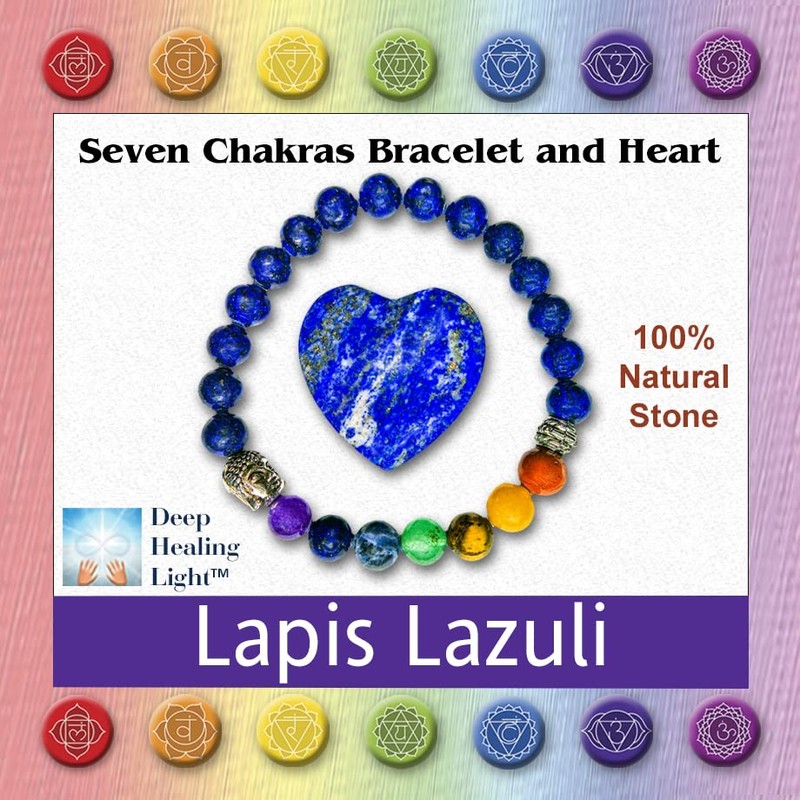 Deep Healing Light 7 Chakras Lapis Lazuli Bracelet and Heart Set for Third Eye Chakra - All Natural Stone Bracelets and Hearts