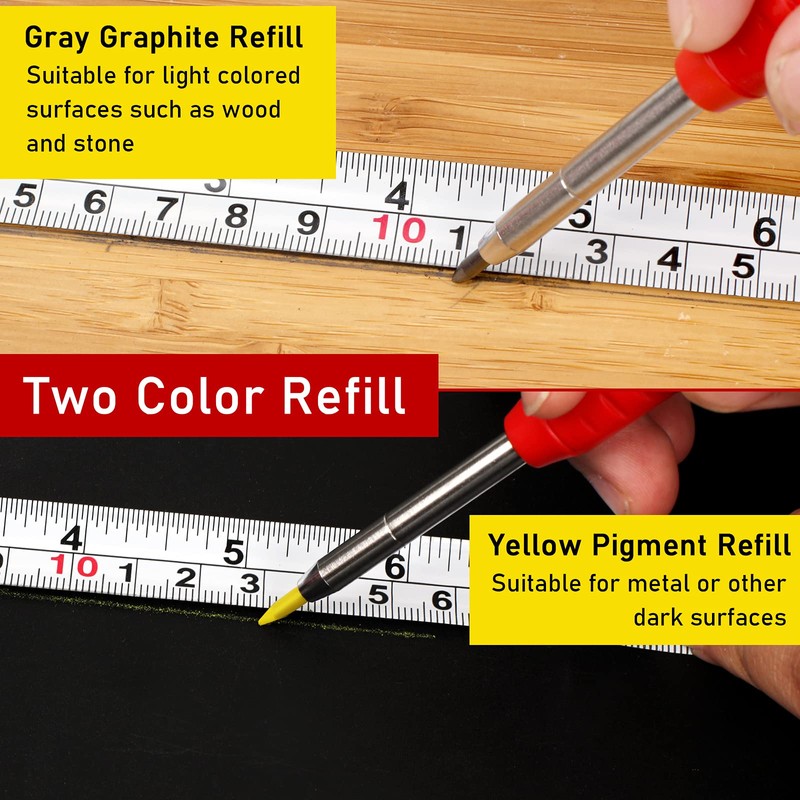 - ✍Two-color refill: Graphite leads are optimized for increased durability and resistance to moisture, with enough leads for use with carpenter pencil. The builders pencil is durable and not easy to break off when writing, which stronger than hard lead. Yellow can be drawed on dark surfaces where grey lead do not draw.