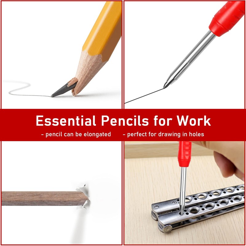 - ✍Thoughtful Design: This mechanical work pencils will give you a comfortable and non-slip writing experience when woodworking. There are grooves on the pencil body to increase the friction when holding the pencil, which can reduce your hands pain of long-time working. The long and thin tip design makes the pencil can reach deep place or narrow hole to mark and draw.