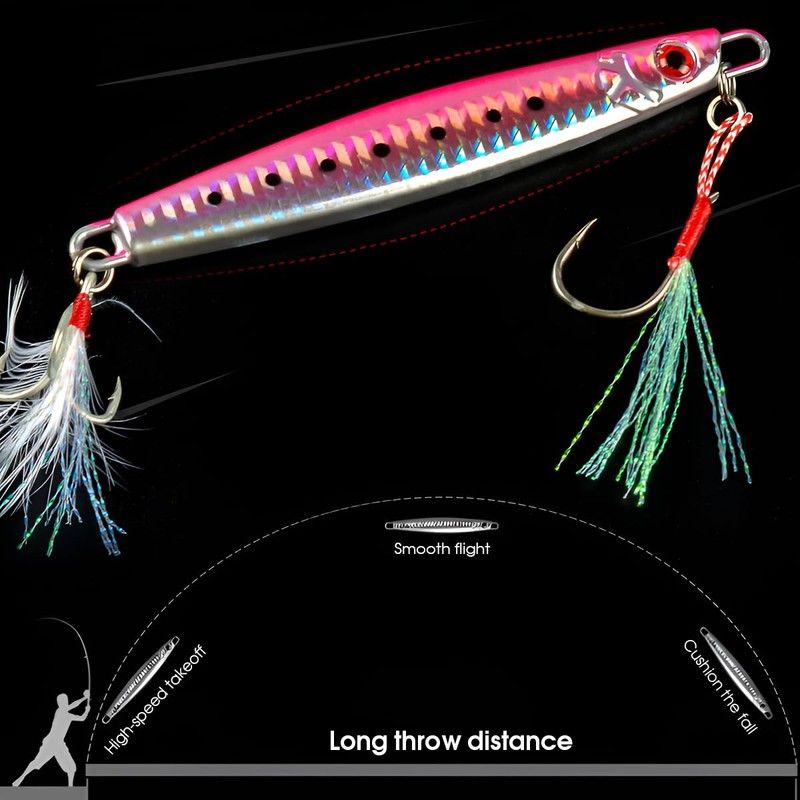 • ✅ Different Weights Sinking Lures: 4 colors with 6 kinds of weight and length. 60g is about 8.7cm. 80g is about 9.7cm. 100g is about 11cm. 120g is about 11.2cm. 150g is about 12.1cm. 180g is about 13.2cm.