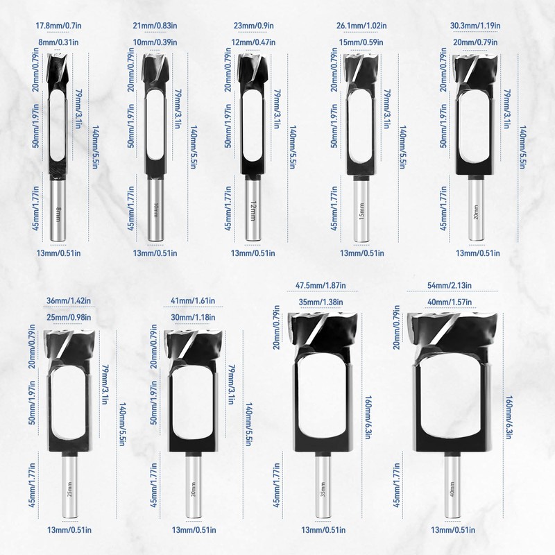 - 9 sizes available: 8mm, 10mm, 12mm, 15mm, 20mm, 25mm, 30mm, 35mm, 40mm to choose from. The hole diameter ranges from 8mm to 40mm, YWNYT wood dowel cutter meets all your woodworking needs