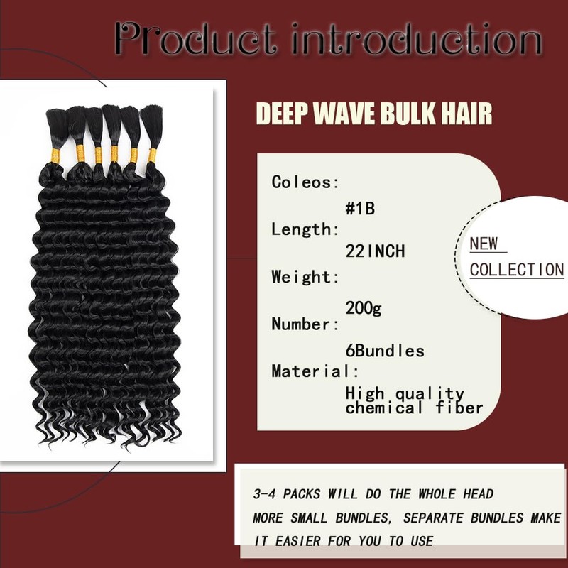 Deep Wave Bulk Hair for Braiding 22 Inch 6 Bundles 200g Natural Black Curly Hair for Boho Braids No Weft Wet and Wavy Braiding Hair Extensions (#1B, 6 bundles/200g)