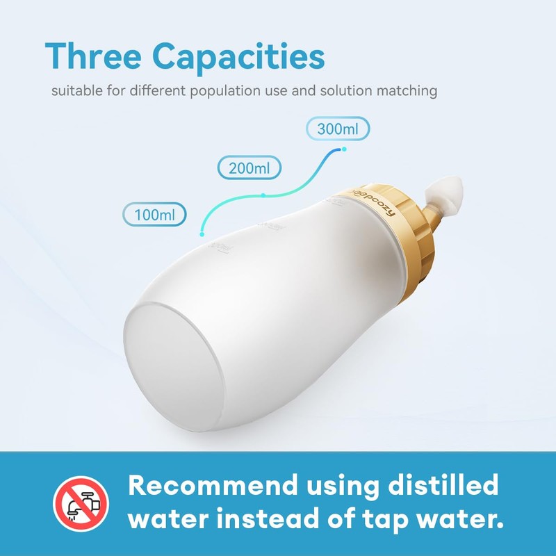 - The 300ml capacity is sized to fit in one hand, and the bottle is provided with three capacity markers to make it easy to choose the right one for you. We also provide a temperature sticker that can be attached to other clean containers to show the temperature of the water suitable for rinsing the nasal passages.
