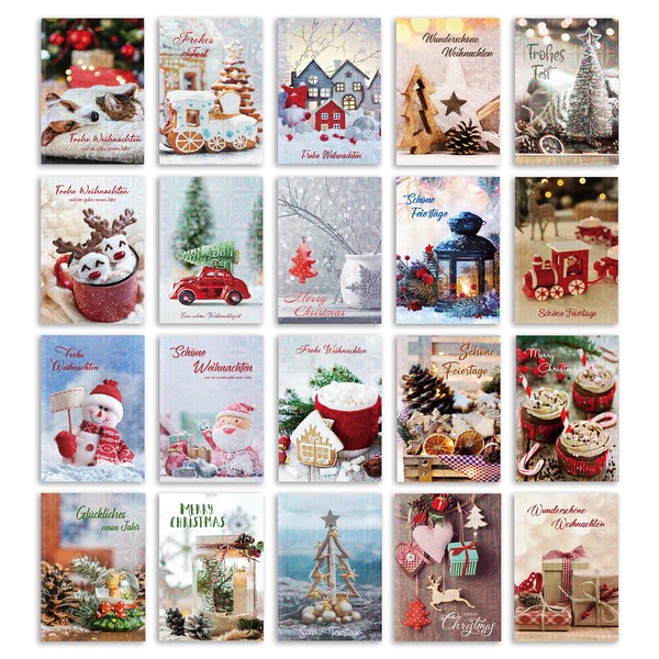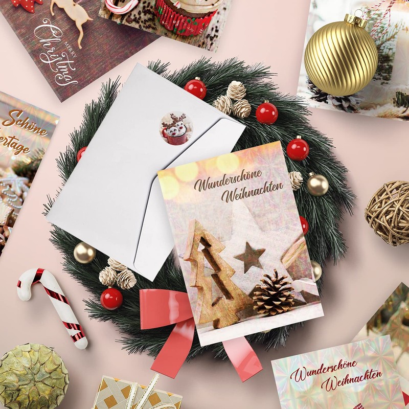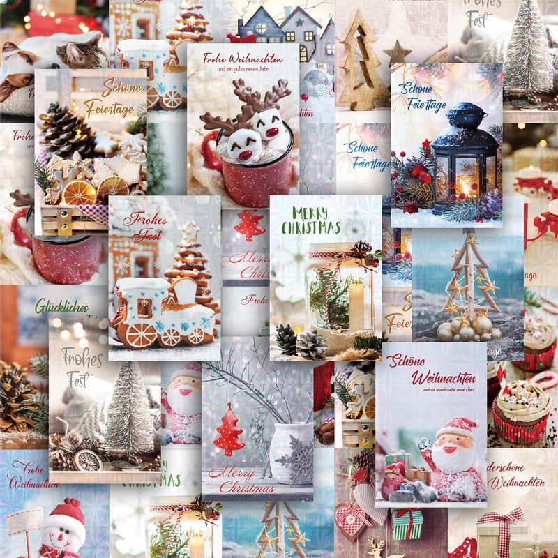 • German and English version: Our Deeplay Christmas greeting cards consist of both a German and an English version. You will receive 16 German greeting cards and 4 English greeting cards that can definitely meet your needs for the two languages.