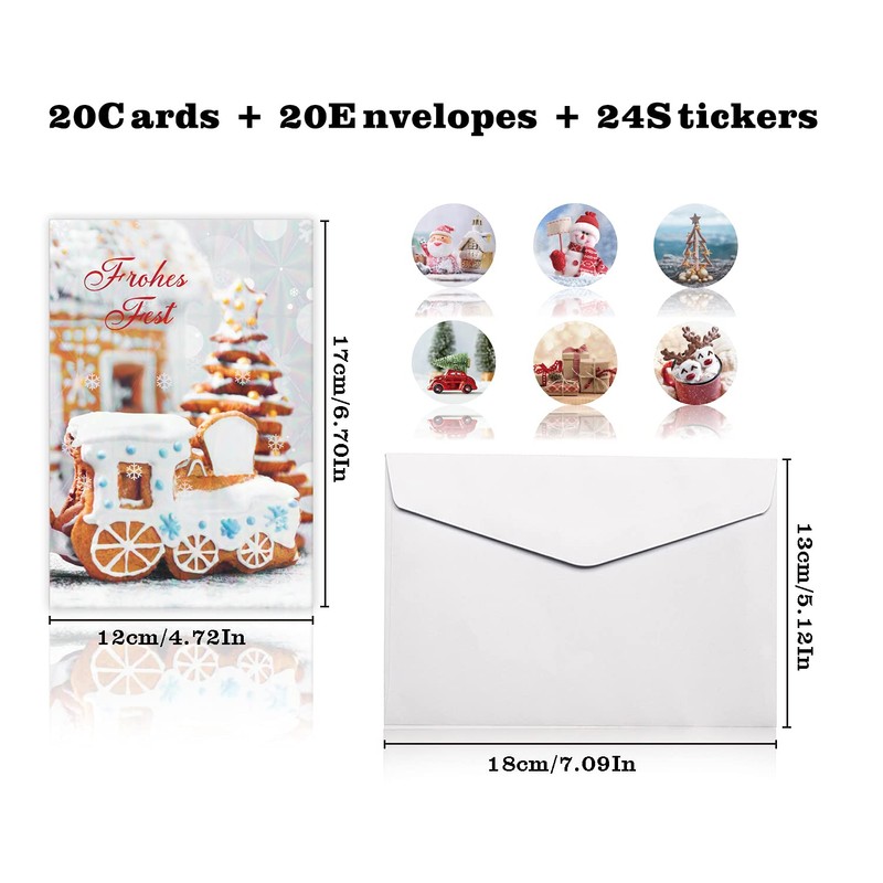 Deeplay Christmas Cards 20 Pack, Greeting Cards with Envelopes, Holographic Folding Christmas Cards with Christmas Mood Patterns for Family, Friends, Pack of 20 With 20 designs. Specifications: Size: Folded card size: 17 x 12 cm Card size (unfolded): 34 x 12 cm Card material: cardboard paper Color: The outer colour of the greeting cards: holographic, colorful, real Christmas scenes The inner colour of the greeting cards: white The colour of the envelope: white Quantity: 20 pieces differently designed Christmas cards, 20 pieces white envelopes and 3 sheets of Christmas stickers (including 24 pieces including 2Stickers) Package includes: 20 x Christmas greeting cards. 20 x white envelopes. 3 sheets of Christmas stickers (total 24 pieces). Note: The envelopes are not self-adhesive, you can use the stickers to seal the envelopes! Each Deeplay Christmas card set comes with white envelopes and stickers with snow elements that allow you to seal your cards well and send them conveniently and secretly to your friends or other people.