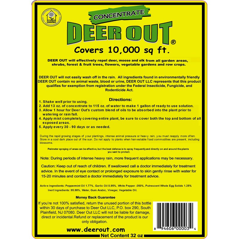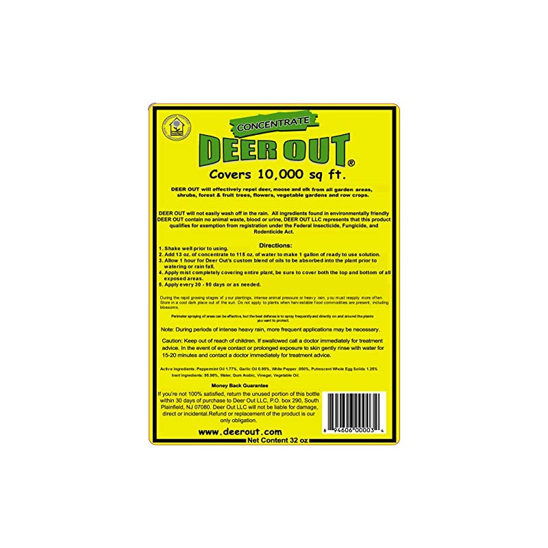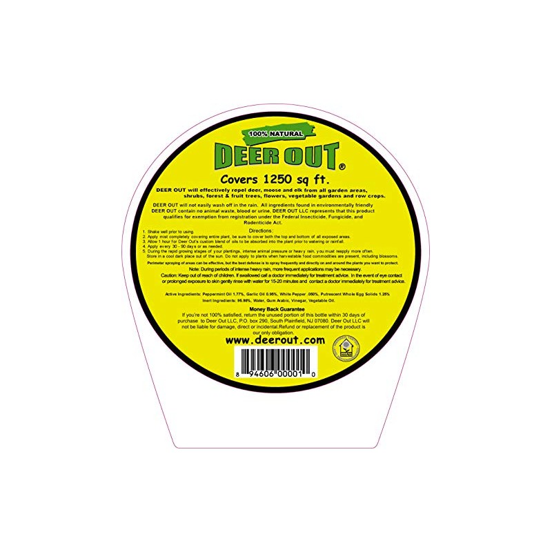 Deer Out is an all natural, pleasant smelling, super long lasting Deer Repellent that is absolutely guaranteed to stop deer from eating your flowers, shrubs, vegetable plants, row crops,trees and vines. 100% money back guarantee. We are certain that you will be pleasantly surprised by our deer repellents peppermint fresh scent and astonished by the results!