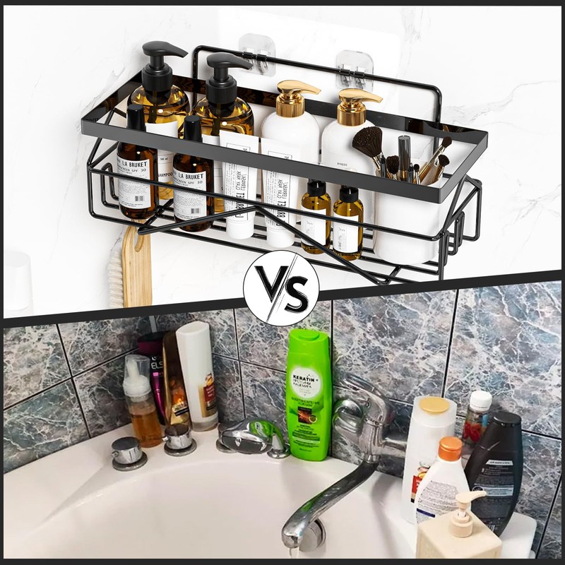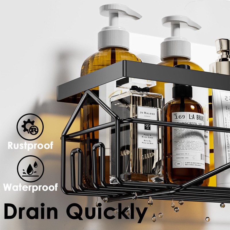 • Rustproof Stainless Steel Construction:Made from premium stainless steel, this shower rack is rust-resistant and corrosion-proof—perfect for humid bathroom environments. The durable metal frame passed a 48-hour salt spray test, ensuring years of rust-free use. Its hollow bottom design promotes proper drainage and ventilation, keeping items dry and easy to clean.