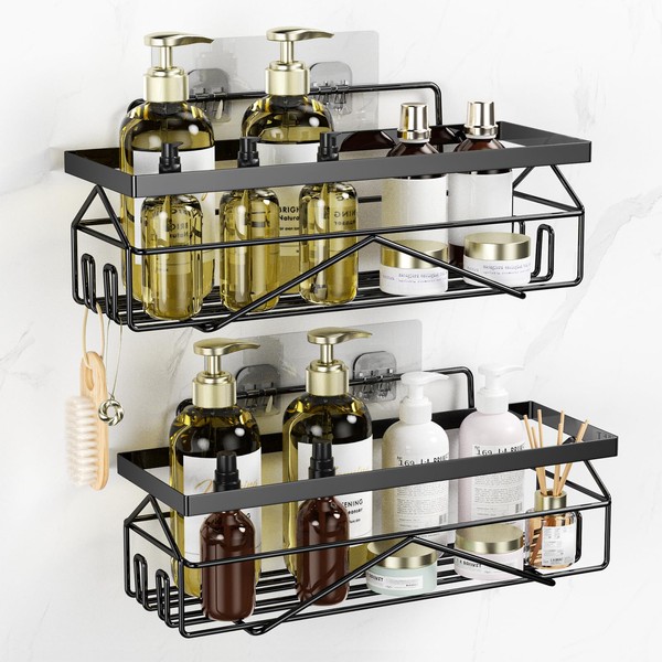 • Dual-Tier Design with Hooks:This Shower Caddy Shelf with Adhesive maximizes space with its dual-tier design, perfect for storing bath essentials. Protective rails keep items from slipping, and two hooks on each side are great for hanging loofahs or razors. Keep everything within easy reach while optimizing space in your bathroom or other living areas.