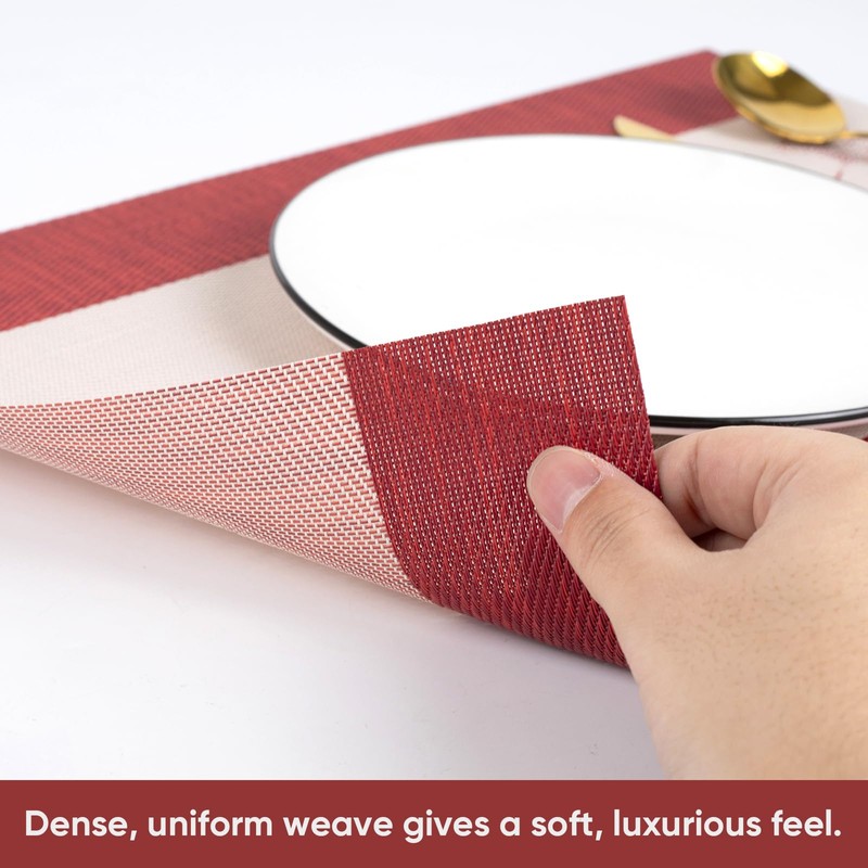 - Premium Eco-Friendly Composite: Crafted from a sustainable blend of PVC and PET—including approximately 30% recycled plastic—our woven placemats help reduce ecological impact. The refined two-tone weaving features solid-color borders at the top and bottom, a mixed-color center, and a delicate ginkgo leaf motif. With a dense, uniform weave, these placemats offer a soft, luxurious feel and a modern design that enhances any table setting.