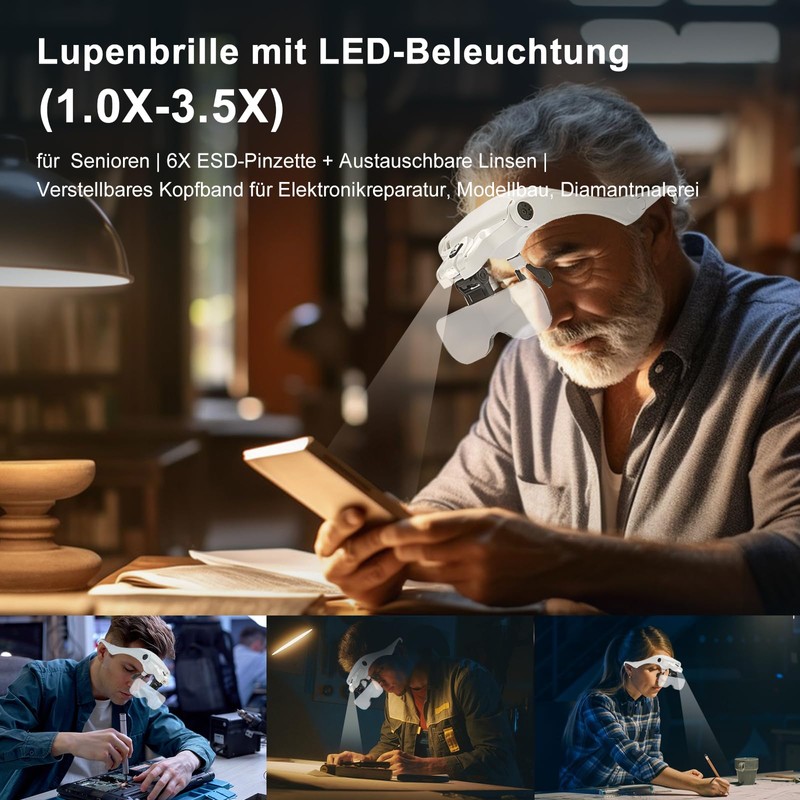 DEESOSPRO Magnifying Glasses with LED Lighting (1.0X-3.5X) for Glasses Wearers and Seniors | 6 x ESD Tweezers + Interchangeable Lenses | Adjustable Headband for Electronics Repair, Model Making