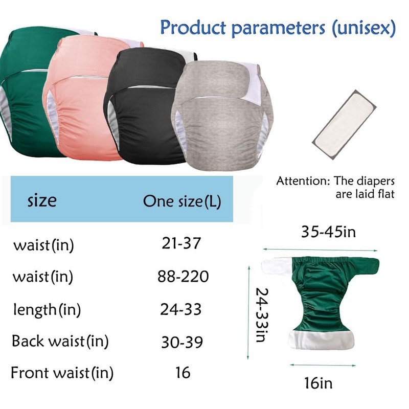 - Adjustable Design: The diaper pants have an adjustable design that can be adjusted according to the user's body shape and comfort.With an adjustable waist and leg design,the diaper pants can be adjusted to best fit the user,ensuring optimal comfort and fit.