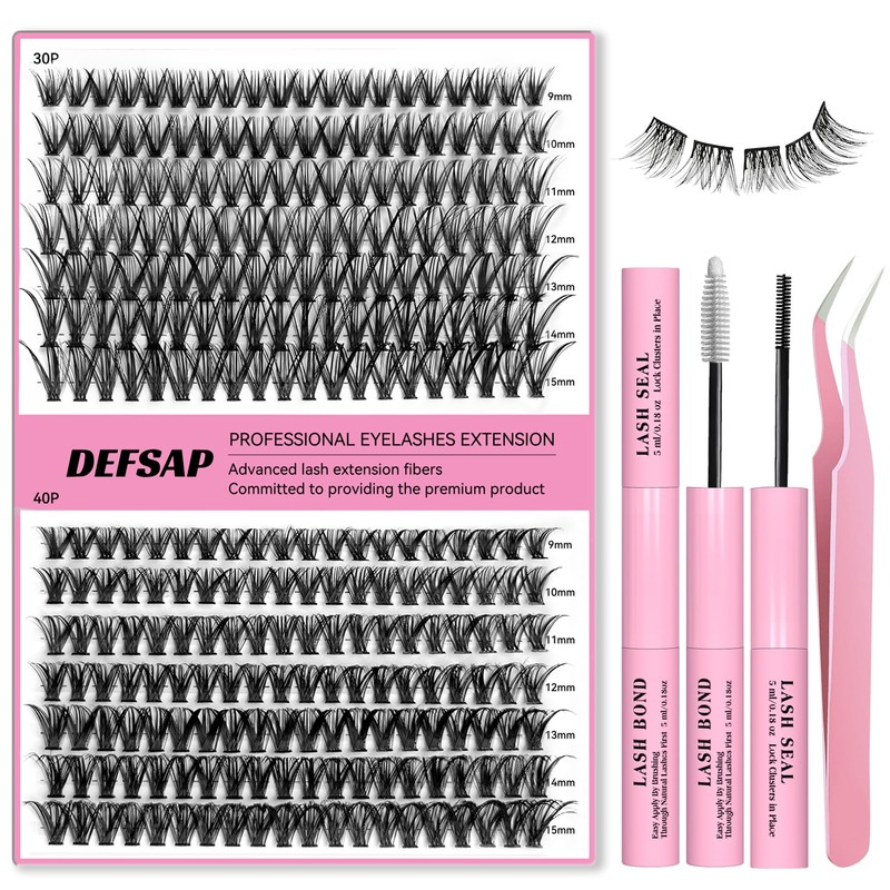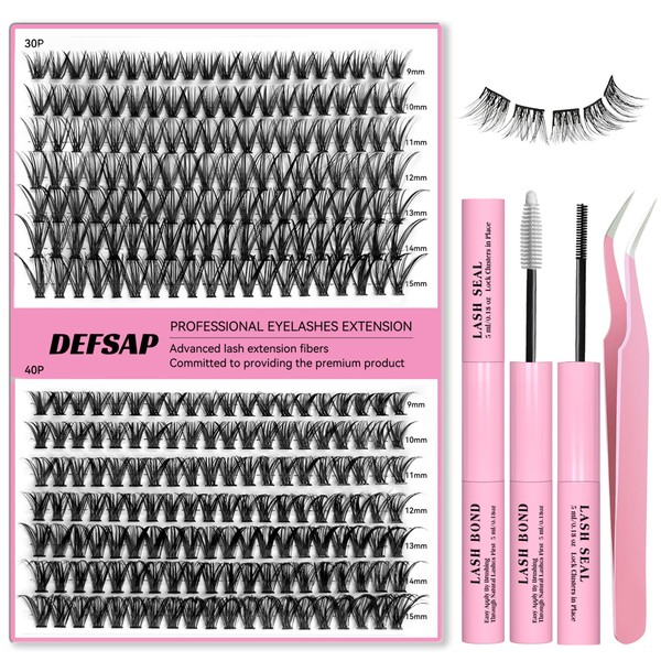 DEFSAP DEFSAP DIY Eyelash Extension Kit, 240pcs lash Extension Kit 9-15mm Mix, 30D 40D Curl Individual Lash Clusters with Bond, and Tweezers