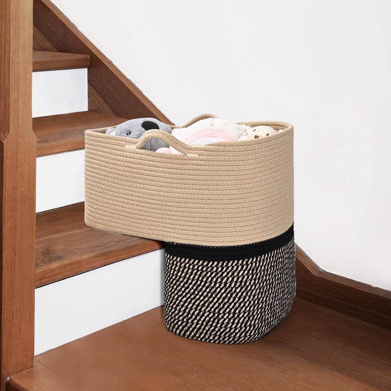 - 🎁COTTON STAIR STORAGE BASKET: Stair Storage bin is hand-woven with cotton rope, which is more enco-friendly and durable. Compared with composite material baskets and jute baskets, it is softer, will not damage the contact surface and skin, and can stand without placing items