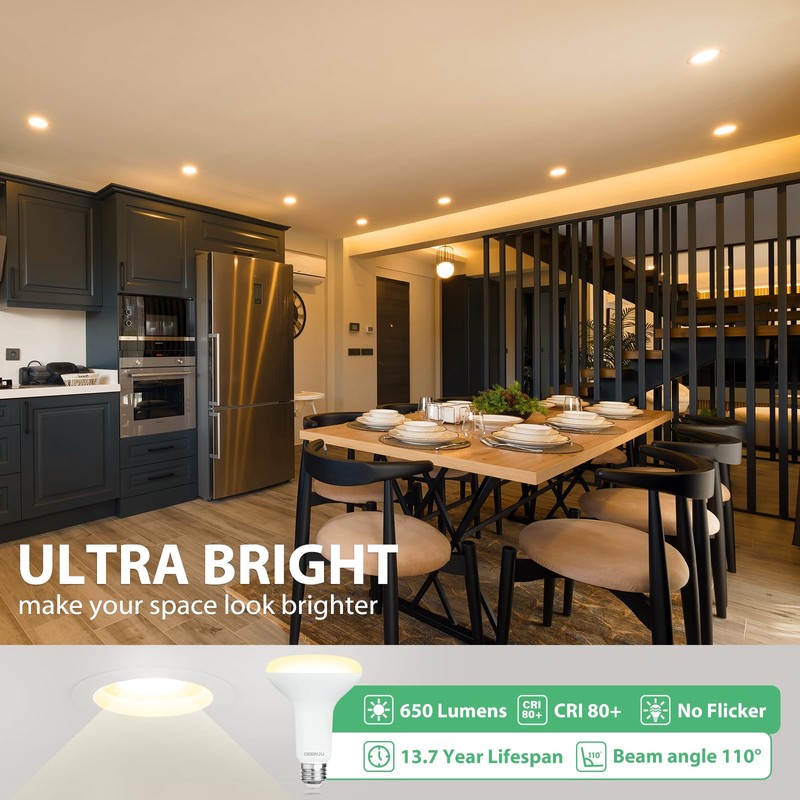 - 【EXCELLENT BRIGHTNESS】Indoor BR30 LED flood light features advanced LED technology, emitting 650 lumens of bright 2700K soft white light, also has high CRI 80+ and a wide 110-degree beam angle, providing vibrant and realistic colors.