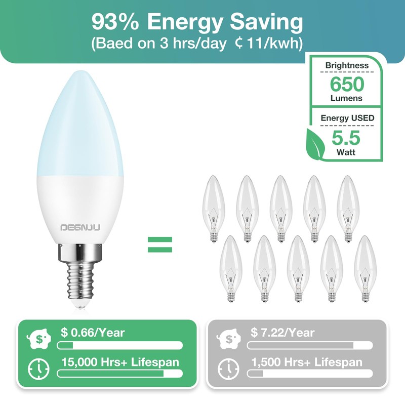 • Energy-Saving: Our candelabra light bulbs consume only 5.5W but can replace 60W incandescent bulbs. Lower your electricity bills while enjoying bright, efficient, and with a lifespan of 15,000 hours, the bulb lasts longer