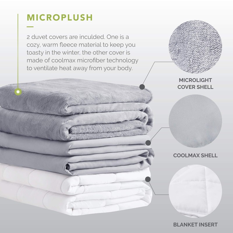 - 2 DUVET COVERS INCLUDED - Pre-assembled minky plush COZYHEAT cover for cold winter seasons and neatly tugged inside the package an additional Coolmax regular cover for hot sleepers or warmer weather. Both have zipper enclosure to securely keep your weighted blanket clean and for easy cleaning.