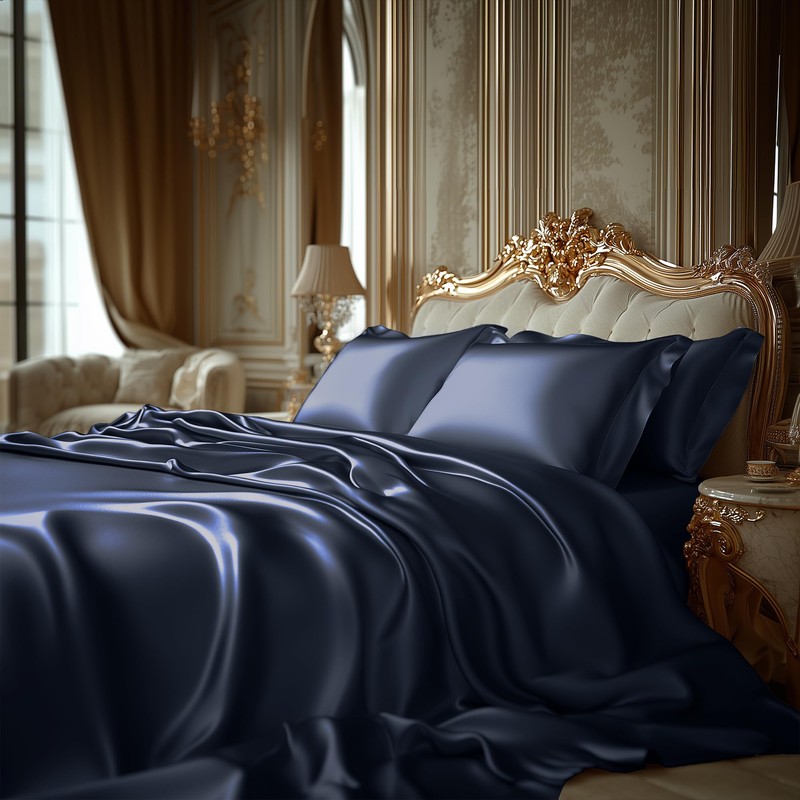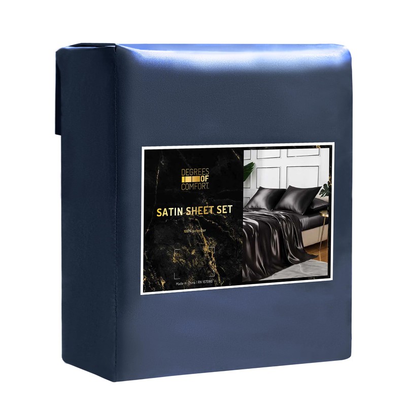 Degrees of Comfort Midnight Blue Satin Sheets Set Full Size, 6 Piece Silky Be...