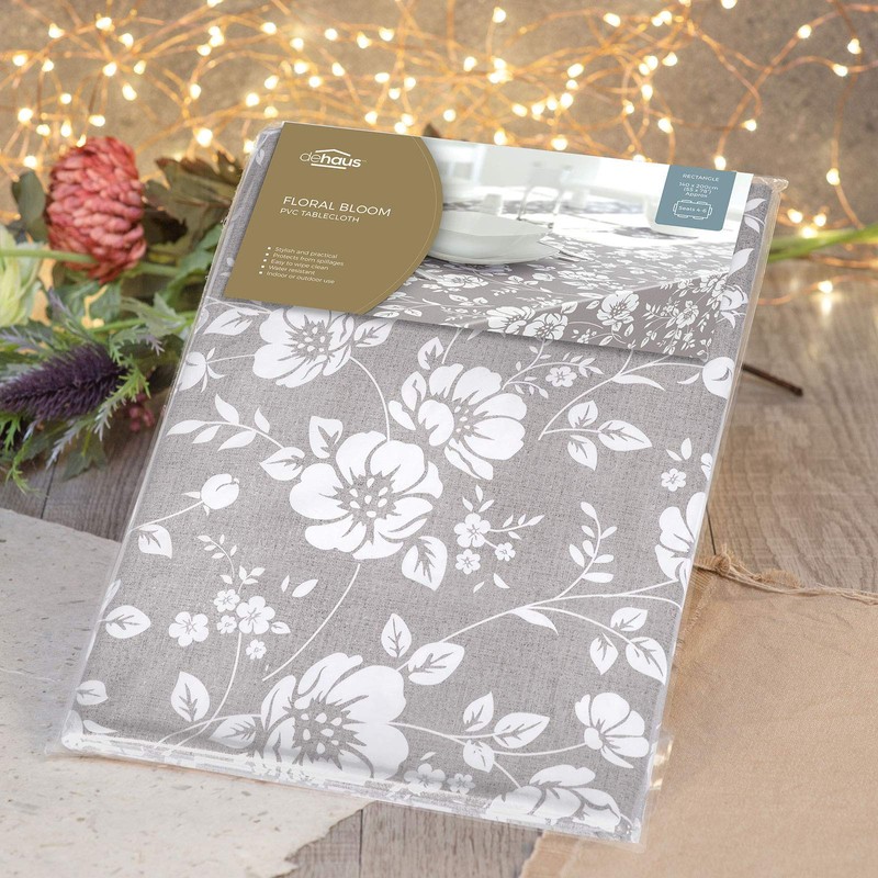 Dehaus® Light GREY Stylish Wipe Clean Rectangular PVC TABLECLOTH 140cm x 200cm (Floral Bloom)