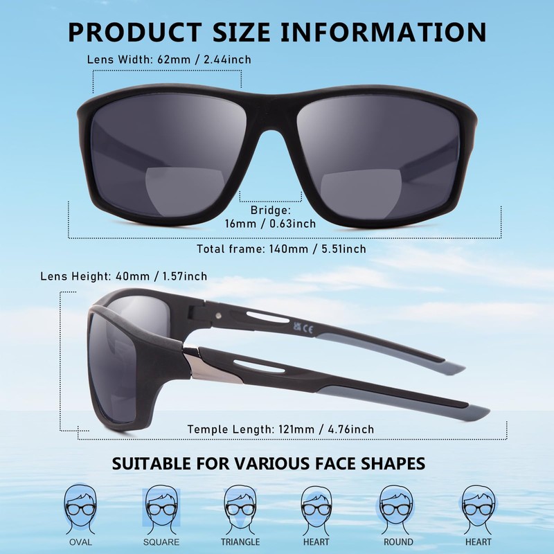 - 【Bifocal Sun Readers】Combined sunglasses and reading glasses, the sunglasses with readers built in provide 2 fields of view to meet your needs. The lenses are divided into 2 different vision areas. Suitable for distance sightseeing and outdoor reading.