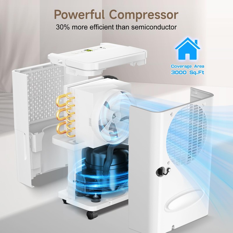 - Our dehumidifier employs a cycle compression system to remove up to 32 pints of moisture per day (at 95°F, 90% RH), making it suitable for spaces up to 3000 sq. ft. It adjusts humidity levels from 30% to 80%, maintaining a dry environment in areas such as basements, bathrooms, bedrooms, kitchens, living rooms, laundry rooms,and RVs.