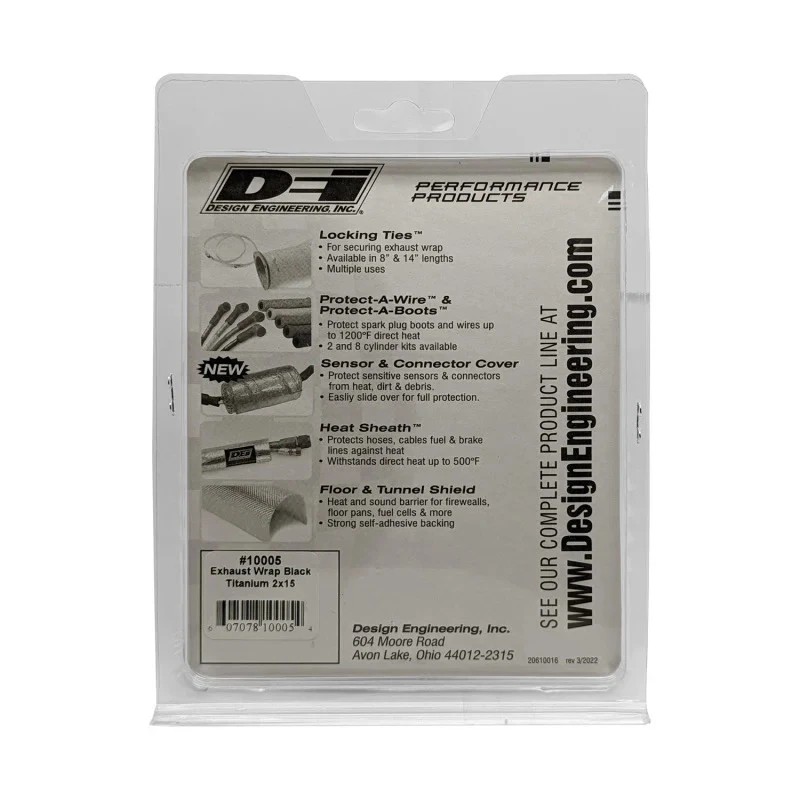 it secures tightly without pre-wetting and is able to withstand direct heat up to 1800F and intermittent heat up to 2500F. Like the original Titanium Wrap, DEI's Black Titanium Wrap maximizes horsepower and performance by reducing underhood temperatures and maintaining high exhaust gas velocity. Wrapped headers and exhaust also reduces the incidence of heat soak, can prevent harmful burns, protect heat sensitive underhood components, and reduce the level of heat transmitted through the firewall and floor of the vehicle for a more comfortable interior. Black carbon fiber look Extremely pliable for a tight & secure wrap Withstands 1800?F direct / 2500?F intermittent heat Pre-wetting roll not necessary for wrapping Reduce underhood temps NOTE: Catalytic Convertors: Wrapping of the catalytic converter is not recommended, as overheating can lead to reduced lifetime of the converter. Instead, try our Corvette Catalytic Converter Shield or create your own shield using our Floor & Tunnel Shield II(TM). Removal: Exhaust wrap is not designed to be moved or removed after it has been heat cycled. After the fibers have been heated, they lose their initial flexibility. This does not reduce the thermal properties of the exhaust wrap. Be aware of this before you decide to remove the wrap. For this reason, you should avoid wrapping any flex-pipes or flex-joints.