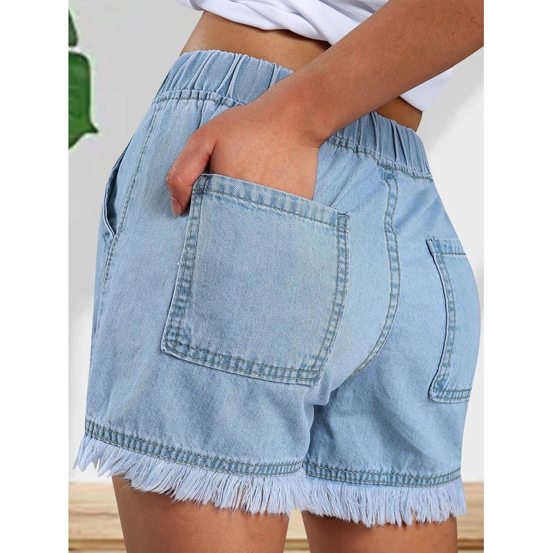 • Features: Women jean shorts with elastic waist, adjustable waist drawstring, front and back pockets, bottom of shorts tassel design, loose fitting ,casual,trendy 2025