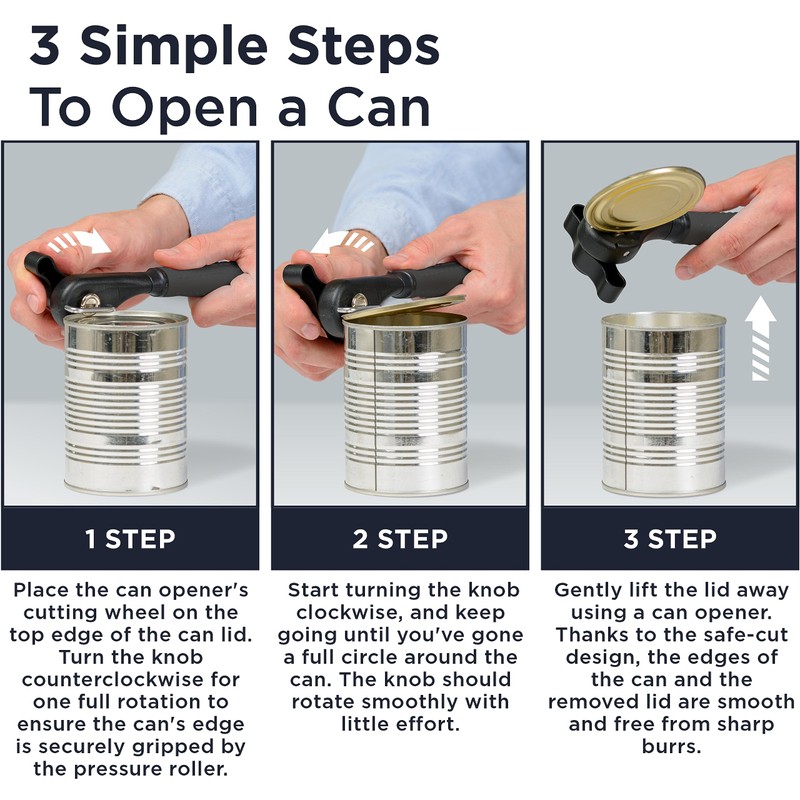 - ✅STRONG AND RELIABLE DESIGN FOR EFFORTLESS CAN OPENING: Discover effortless can opening. With its extra-large turn knob, our easy can opener simplifies can opening, working with your motion, not against it. Its robust patented design ensures smooth cuts, while the oversized handle provides an easy grip. It works perfectly as right- and left handed can opener for adults.