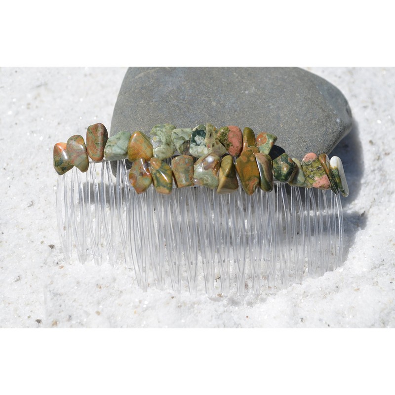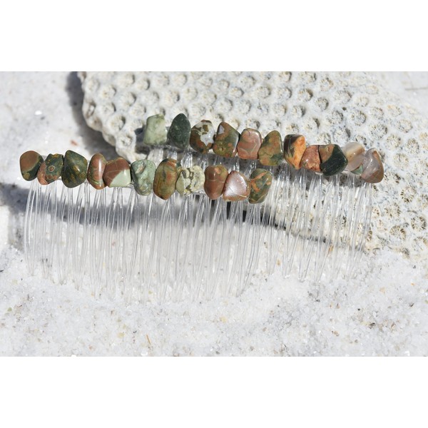 Pair of attractive rainforest rhyolite stone hair combs. The rain forest rhyolite stone hair combs are adorned with small tumbled rain forest rhyolite stones. The rain forest rhyolite hair combs are the perfect accessory to a night out, and can dress up an outfit or be used for a special event, like a quinceanera, first communion, or even a wedding. The hair combs are hand made in the USA and come from a smoke free environment The rain forest rhyolite hair combs measure: 67 mm x 41 mm x 7 mm or 2.65 inches x 1.6 inches x .23 inches