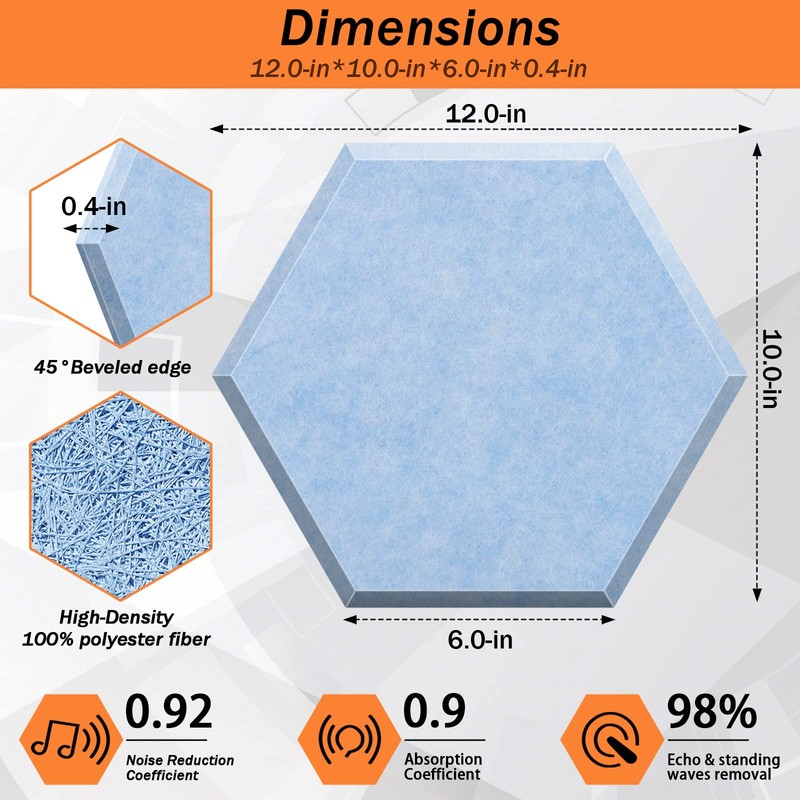 - 【Stylish Appearance】 The hexagonal design of our Acoustic Panels is not only functional, but also stylish, making them a perfect fit for any room decor and acoustic treatment. The unique angled design of the Sound Proof Foam Panels reduces sound and creates a beautiful appearance. The panels come in a variety of colors for DIY mix and match.