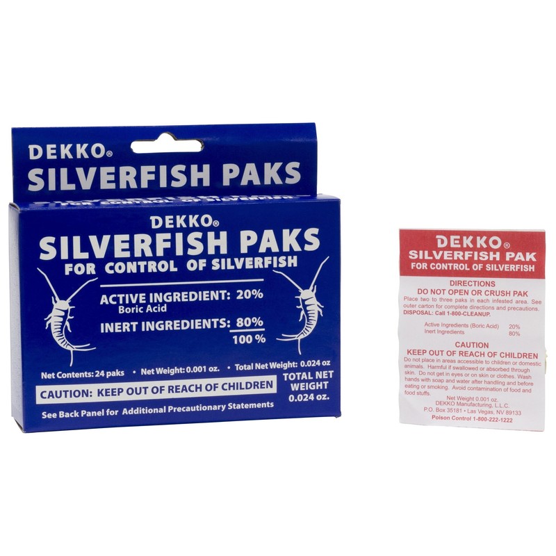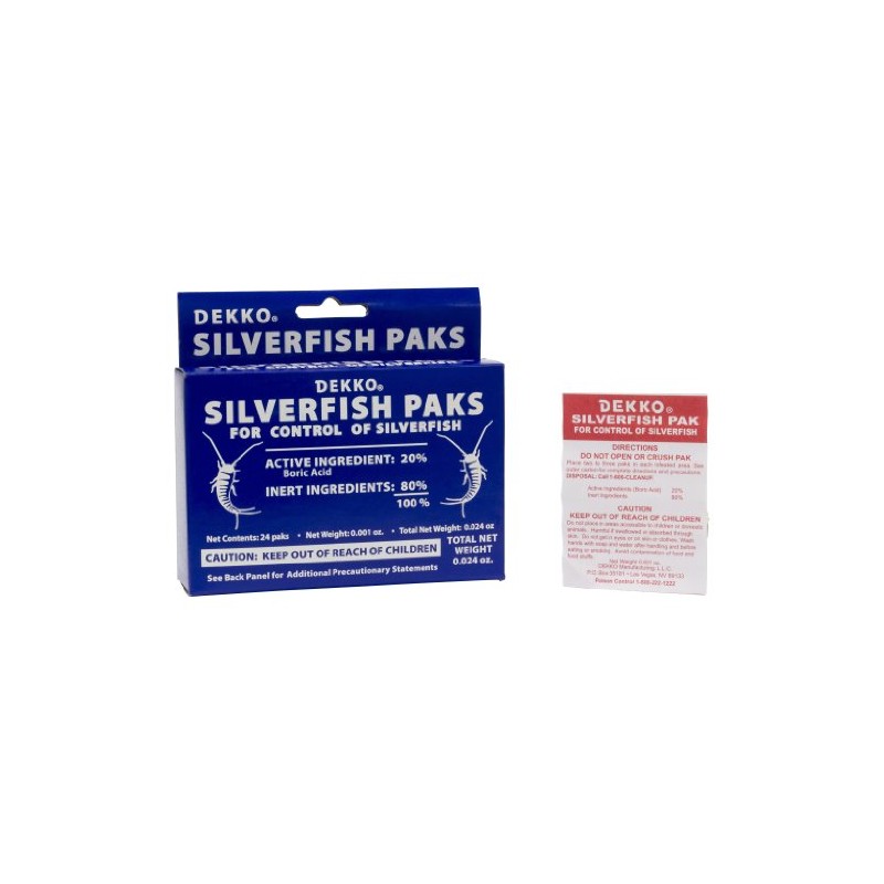 - Dekko Silverfish Paks are to be used in residential housing (indoors and attics), basements, closets, bookcases, around household clothing and fabric containers, drawers, and also rugs and carpets.