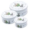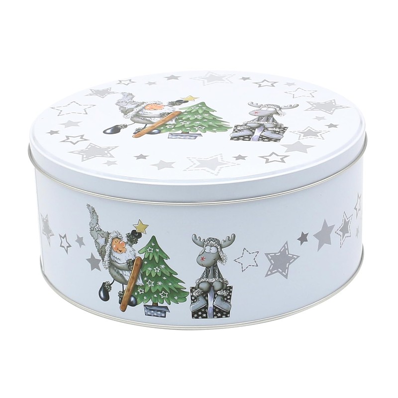 - This set of round metal tins with a charming Santa and Elk motif in white is the perfect addition to your Christmas decoration and offers practical storage space for Christmas treats and small gifts. With three different sizes 19 x 19 x 9 cm, 17 x 17 x 7 cm and 14 x 14 x 6.5 cm, you have versatile ways to display and store your festive treasures in style.