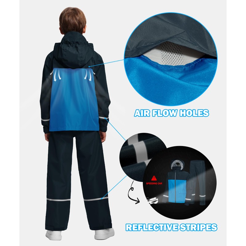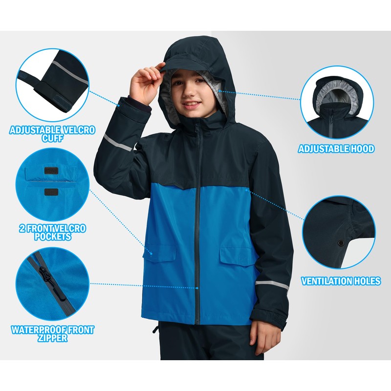 - Hooded Rain Jacket with Added Features: The rain jacket features a waterproof hood, an exposed water-resistant reverse-coil center front zip with a zipper garage, and adjustable hook-and-loop cuff tabs for a secure fit. Our kids rain gear also includes two flap pockets on the front, inner mesh lining for better breathability, 2 air flow holes on the back for added comfort, and a reflective strip on the sleeves to ensure your child's safety at night