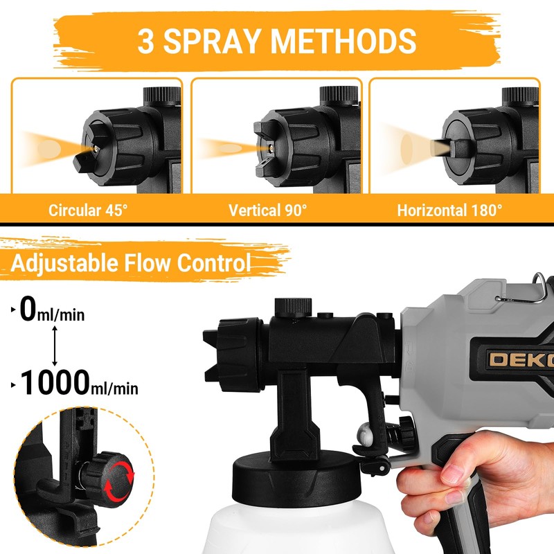 DEKOPRO Paint Sprayer, 700W Electric Spray Paint Gun for House Painting Furniture Cabinets Fence Walls Door Garden Chairs, Easy to Clean 4 Nozzles and 3 Patterns 800ml Container Gray