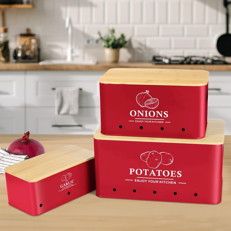Dekosilave Kitchen Vegetable Storage Set of 3, Metal Onion Garlic Potato Storage Set, Kitchen Canisters Vegetable Keeper Containers with Aerating Holes and Wooden Lid (Red)