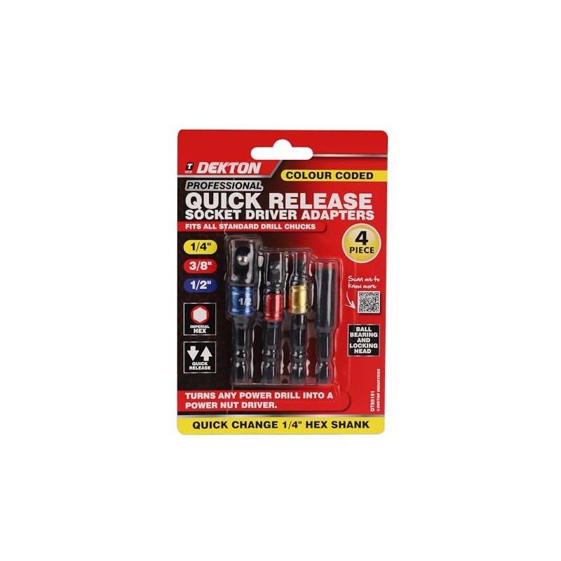 - Convenient Storage: The Dekton 4PC Impact Socket Adaptors come in a compact design that allows for easy storage and transport. Their small size makes them a perfect fit for your toolbox or glove compartment, ensuring that you have them on hand whenever you need them. Keep your workspace organized and efficient with these essential tools neatly stored away.