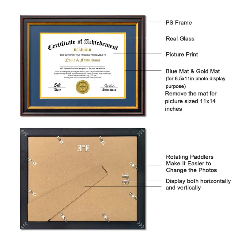 - EXQUISITE DESIGN: Frame Color is Black with Gold lines.1 Pack picture frame to provide an elegant display for your 8.5x11 certificates and documents,without mat.