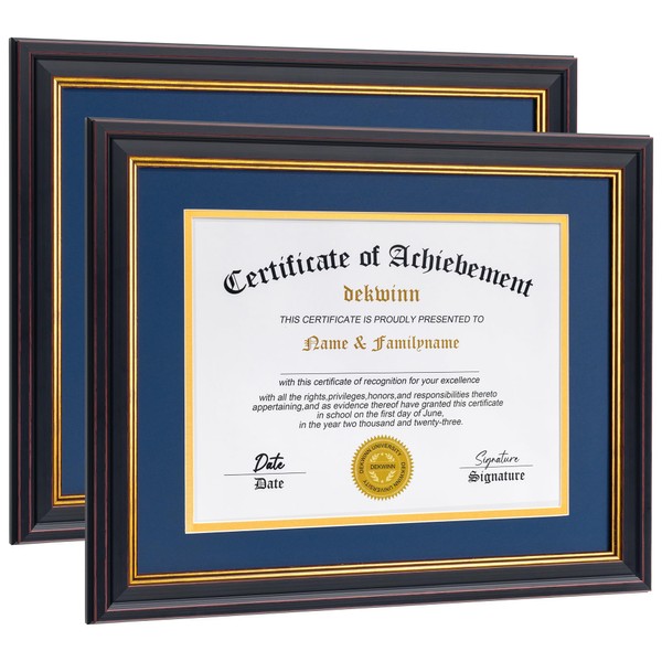 DEKWINN,Diploma Frames 8.5x11 with Mat or 11x14 without Mat,2 Pack Certificate Document Frame with Real Glass,Black Gold & Burgundy Molding(Blue/Gold Double Mat)