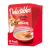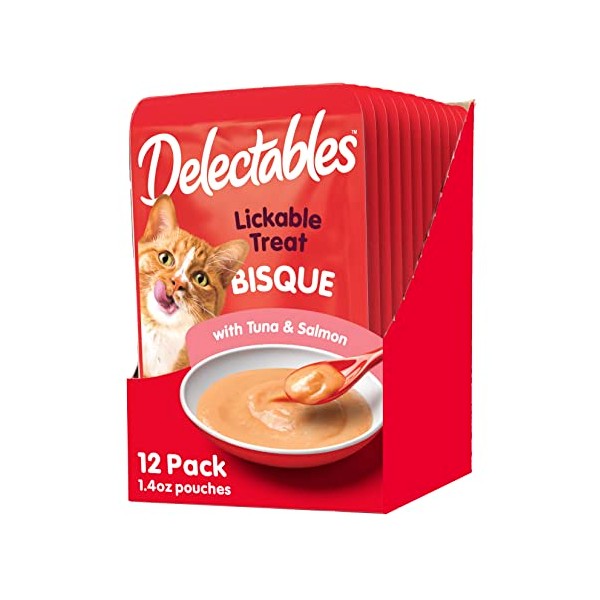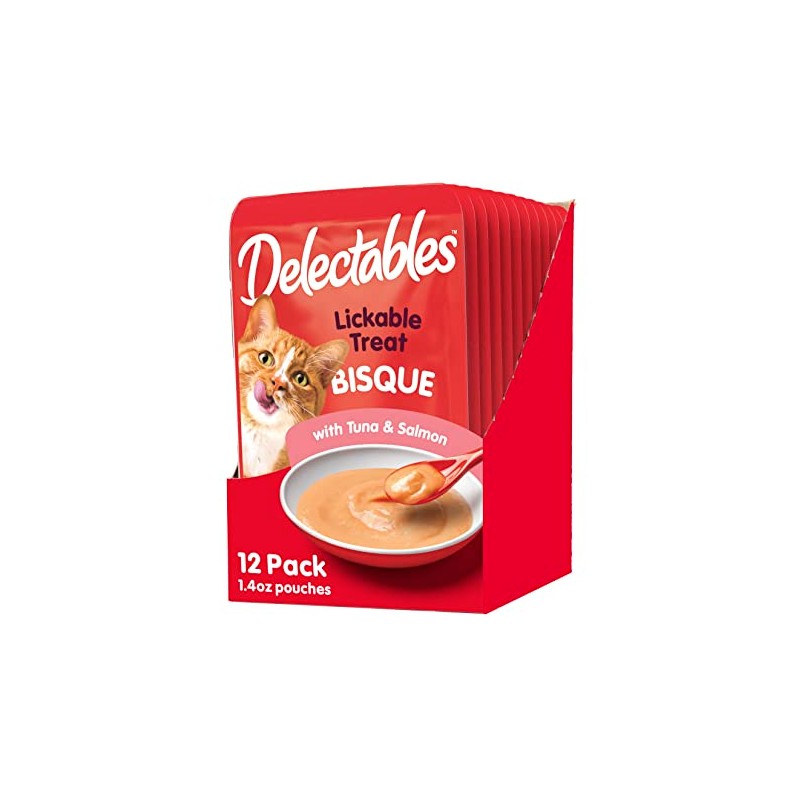 - This pack of Delectables Bisque contains twelve (12) 1.4-ounce lickable cat treats.