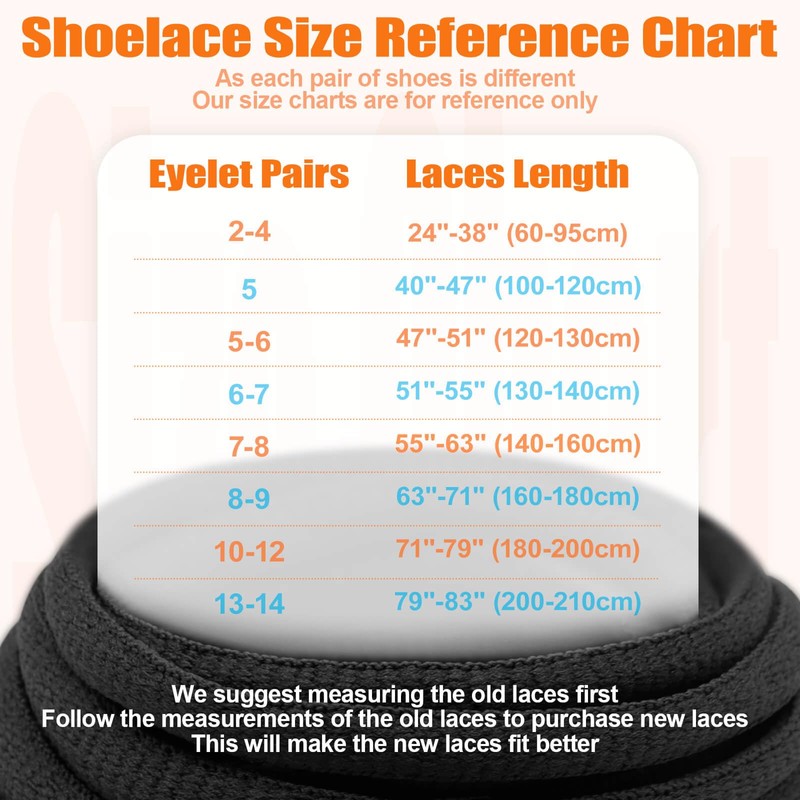 - [Steps to Use] Take off the shoelace that is now on it and measure the length from tip to tip. This is the required length. If your previous laces are too short or too long, add or subtract from your laces. Attention: the length of 60 cm - 95 cm is more suitable for shoes with less than 4 holes; For shoelaces over 100 cm in length, we recommend shoes with 5 or more holes