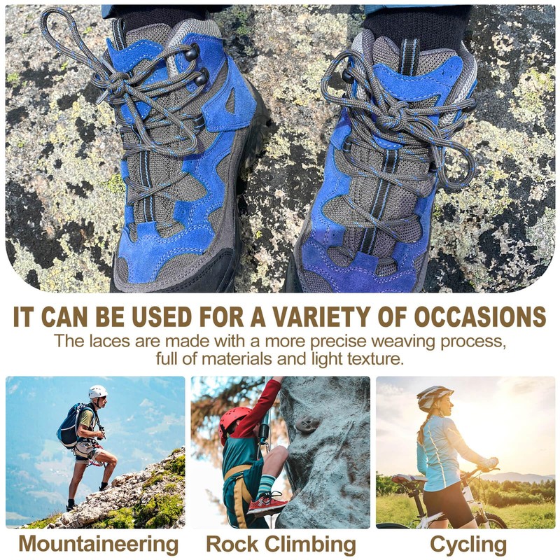 - SUITABLE FOR MOST SHOES: See pictures, mixed-color designs make your boots more stylish and individual. Round hiking shoe strings for boots are very natural in colours, soft and delicate in texture. Our premium round climbing laces are available in a variety of fashionable hiking boots, waterproof hiking boots, work boots, safety boots, trekking boots, climbing boots, hunting boots and all outdoor boots. You can match them to any boot style preference.
