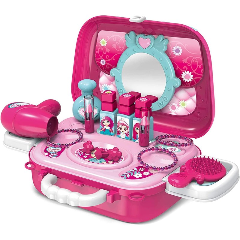 Delex Pretend Play Makeup Set Role Play Jewellery Kit for Girls Toy Set 2 in 1 Princess Pink Vanity Dressing Table Mini Carry Case Portable with Accessories