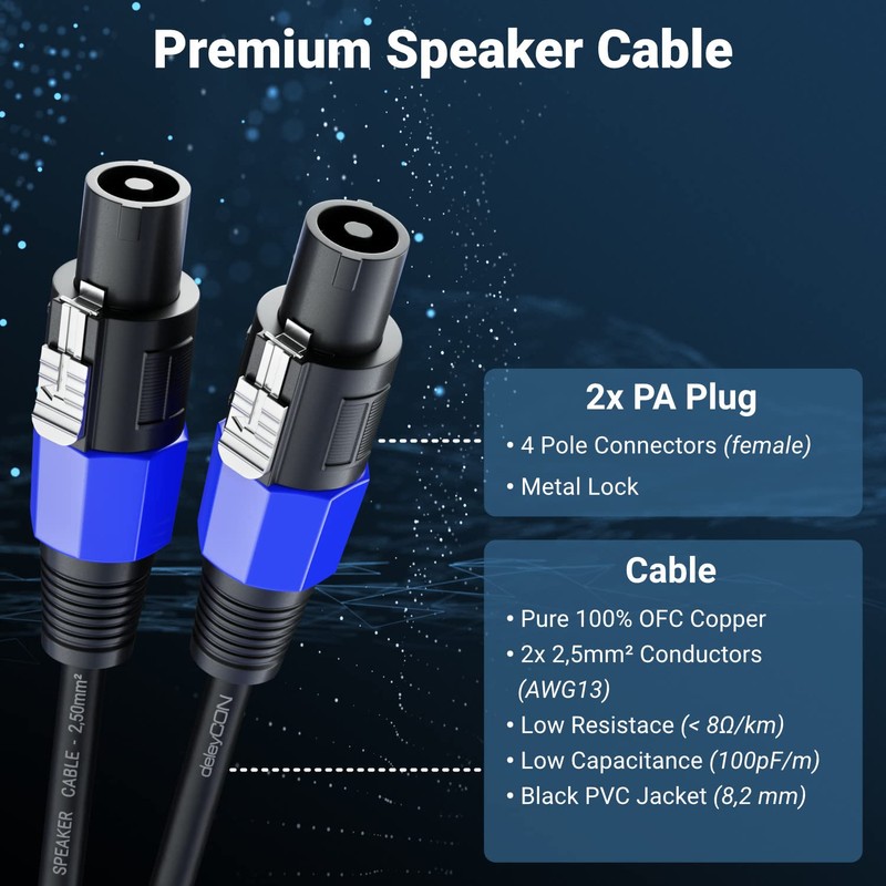 The deleyCON speaker cables are ideal for use on stage, studio, rehearsal room or in mobile use with DJ, bands, musicians, live use.