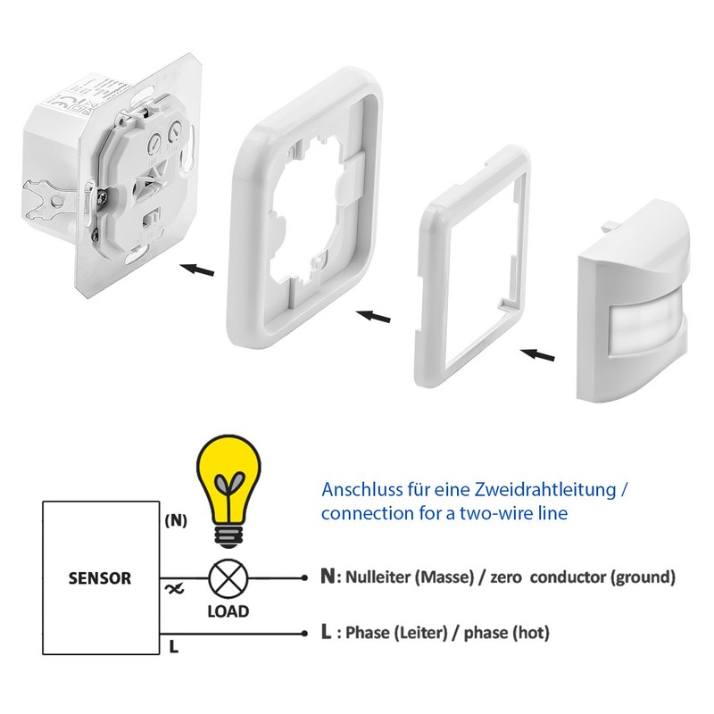 - 160° detection range, motion detection, range of up to 9 m, protection class IP20, adjustable light duration (10 seconds to 7 minutes), designed for flush-mounted installation
