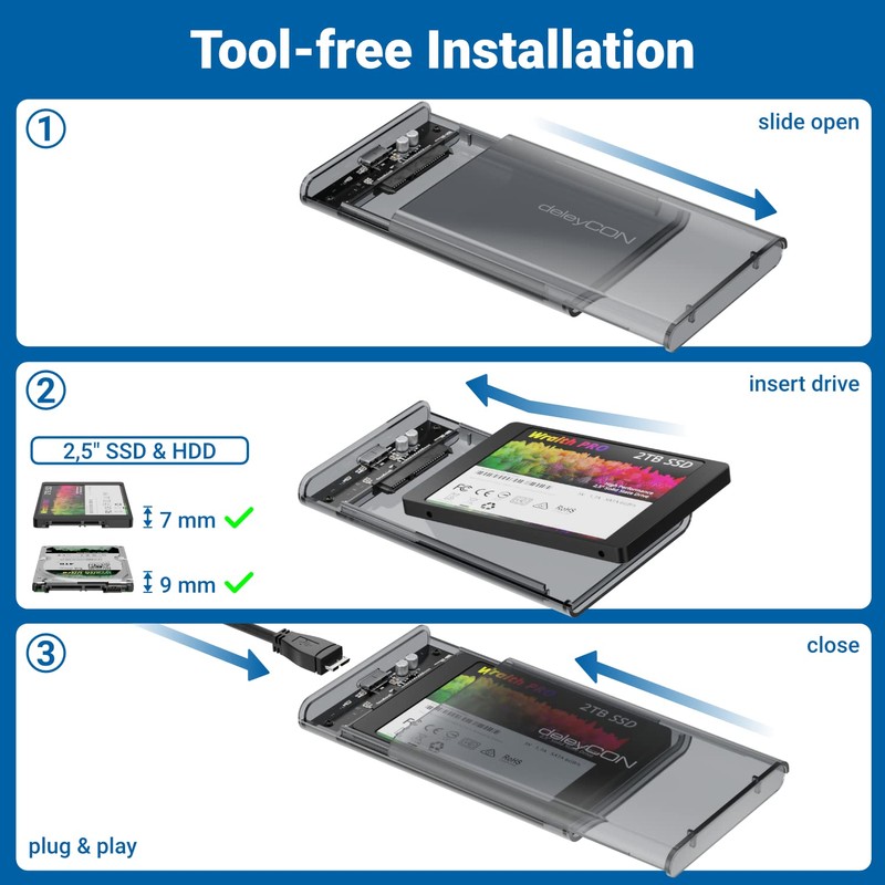 - deleyCON Hard drive enclosure 2.5 inch // For 7 mm & 9.5 mm SATA HDD SSD hard drives