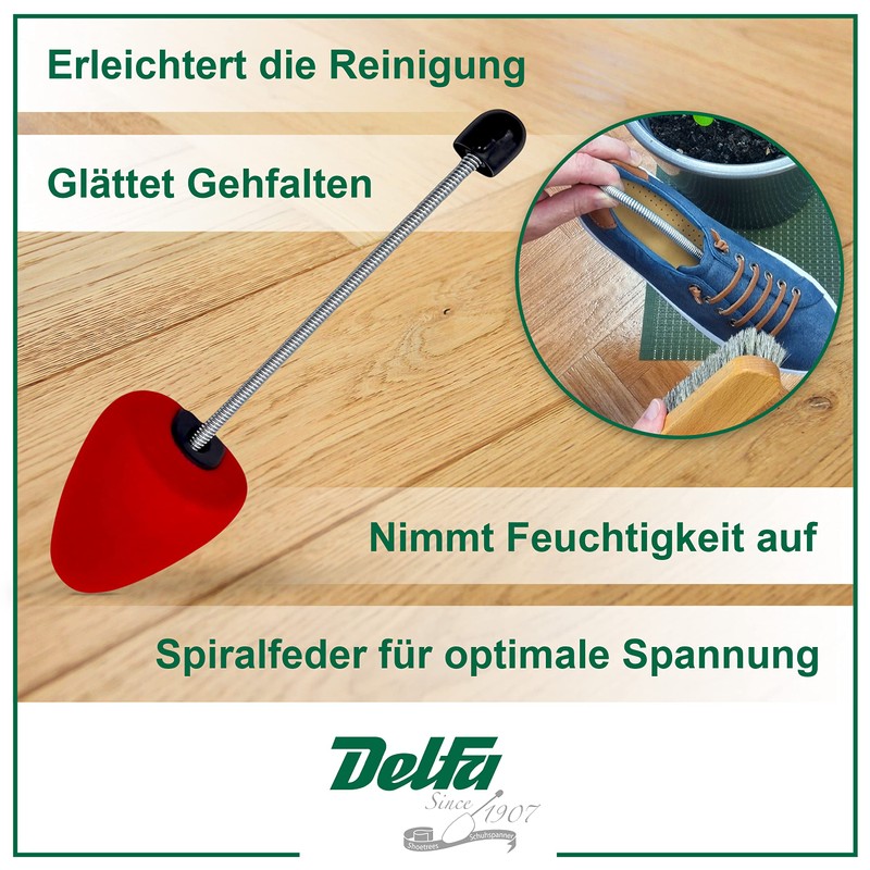 The foam shoe stretcher with a spiral spring can be used for all pumps, high heels and classic women's shoes in all women's sizes, even for sizes over 40. The shoe shapers are antibacterial and washable, prevent wrinkles and maintain the shoe shape, especially with soft upper leather or textile material. The viscose flock ensures very good absorption of moisture. A confusion of right and left is eliminated, because the shape is suitable for both shoes of a pair. Our foam shoe trees are completely produced in Germany. (Please note: colour may vary from the picture).