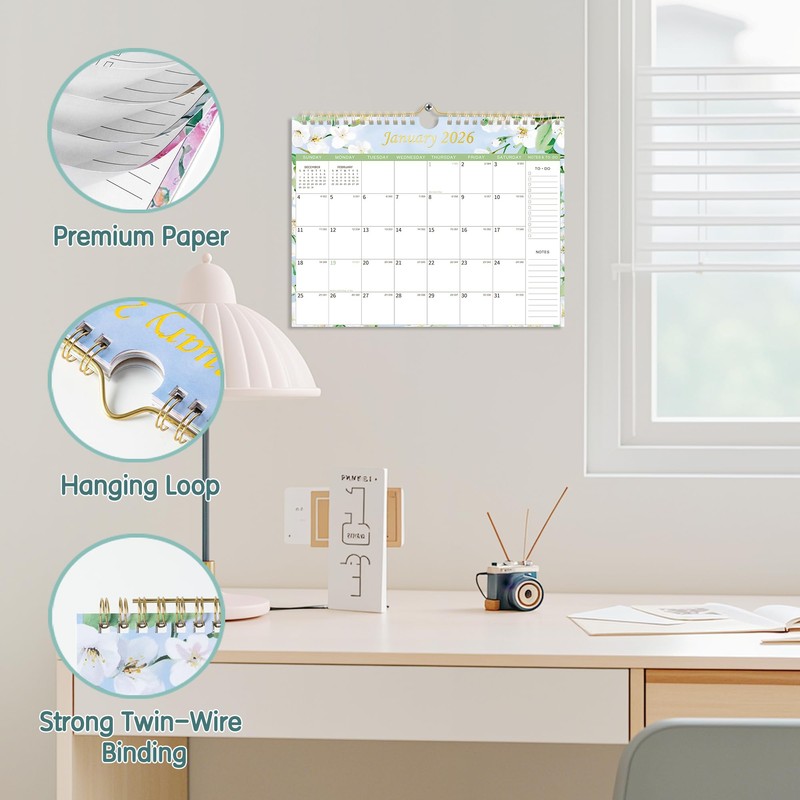 - Easy Double-Wire Binding Function: With its double-wire binding and smooth page turns, this calendar for wall lays flat on the wall, making it a stylish and practical wall calendar option. Whether you're switching months in a hurry or taking your time to review your plans, this design ensures quick and easy access to your schedule with minimal effort.